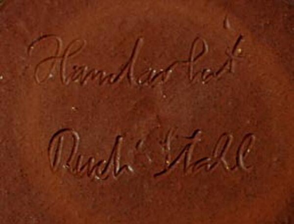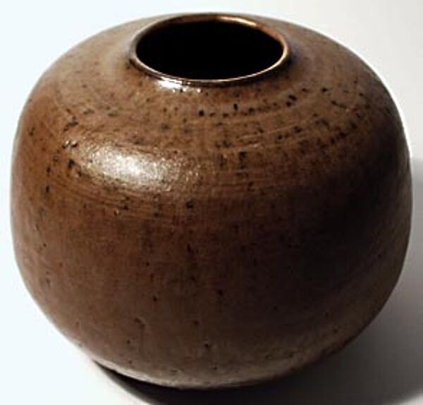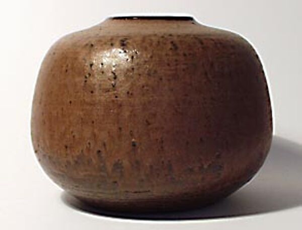 Gedrückte Kugelform, brauner Scherben. Leicht zum Scherben kontrastierende, ebenfalls braune, fein strukturierte Glasur. Höhe knapp 13 cm, geringe Gebrauchsspuren. Unterseitig gemarkt sowie bezeichnet "Handarbeit". Wohl 40er, 50er Jahre.