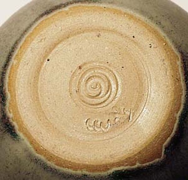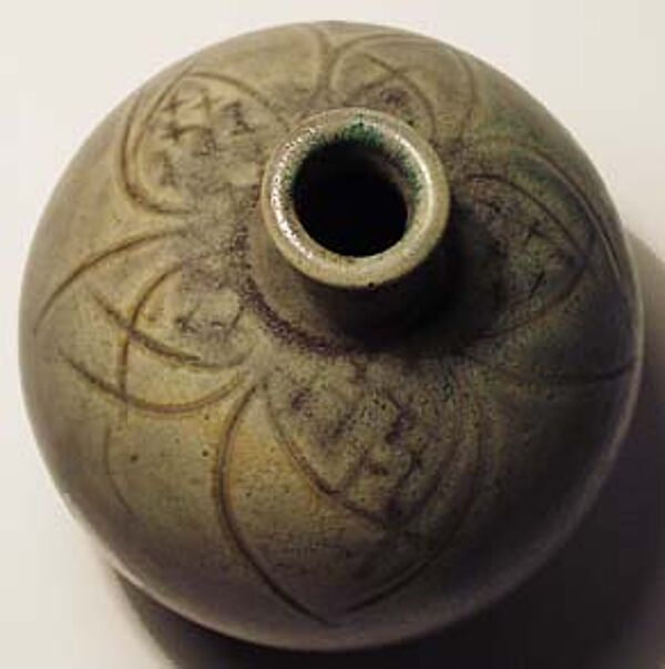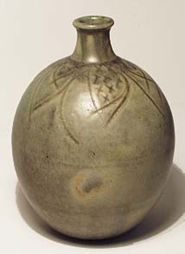 Kalebassenartiger Korpus aus hellbraunem Scherben mit Glasur in Grautönen, im Schulterbereich blattartiges Ritzdekor. Höhe ca. 15 cm. Unterseitig gemarkt (ungedeutet), wohl Deutschland der 60er, 70er Jahre.