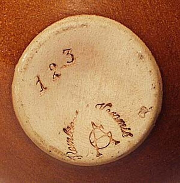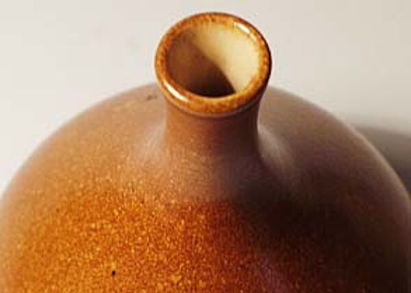 Kalebassenartiger Korpus mit lang ausgezogenem Hals, akzentuierter Mündungsrand. Heller Scherben mit orange-rotbraun gefleckter Glasur. Höhe ca. 15 cm. Unterseitig gemarkt: legiertes "AG" sowie "Rembsen... Keramik" (ungedeutet), wohl Deutschland der 60er, 70er Jahre.