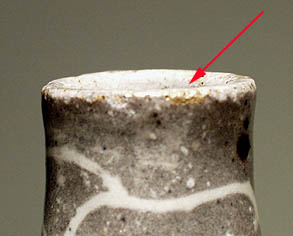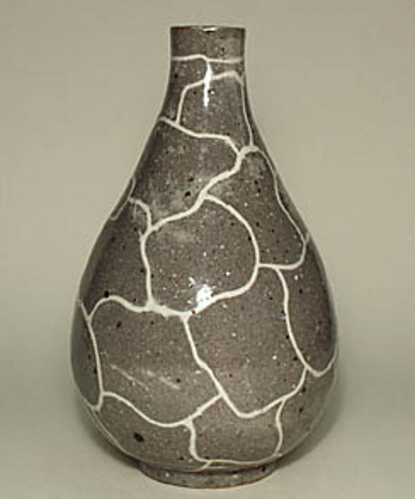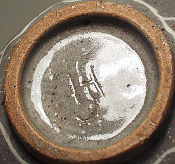 hellbrauner Scherben. flaschenkürbisähnliche Form (nicht ganz symmetrisch). graue Glasur mit weißen bzw. teilweise braunen Einsprenkelungen bzw. großer Craquelebemalung in weiß. relativ grobe Oberflächenstruktur. H. 21,5 cm. kleiner Chip am Stand. am Mündungsrand kleine Glasurschäden. Ritzmarke HJ - ungedeutet. 1940er/50er Jahre.