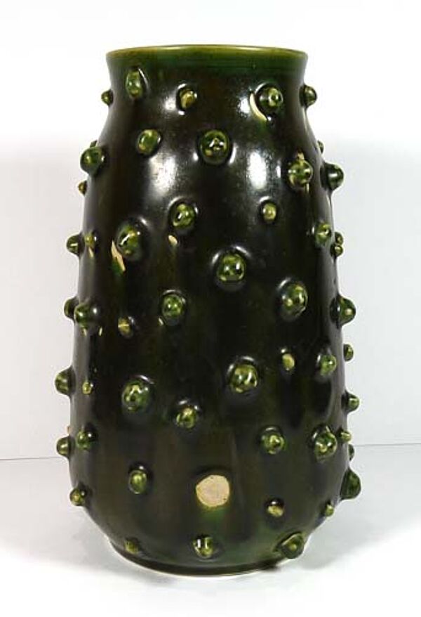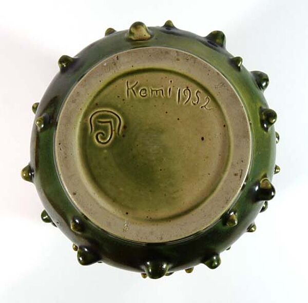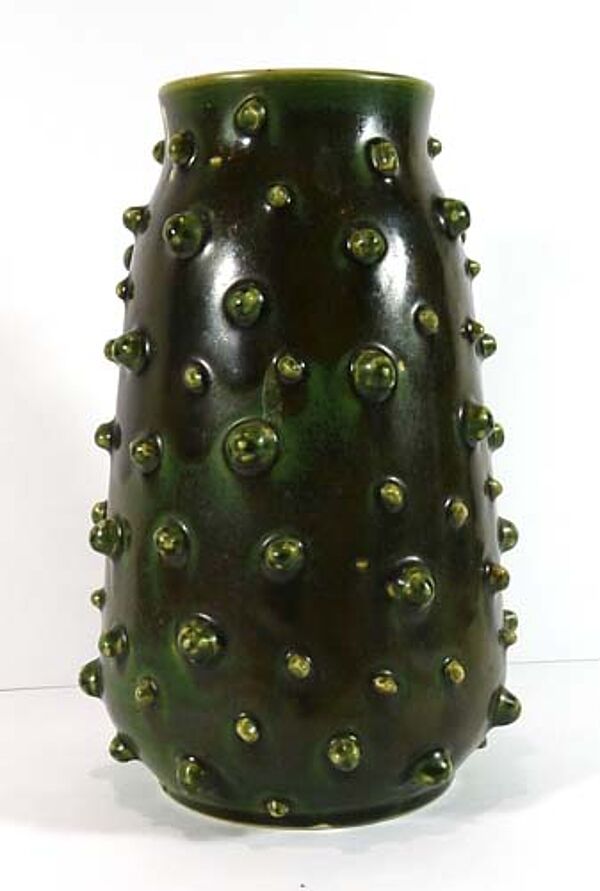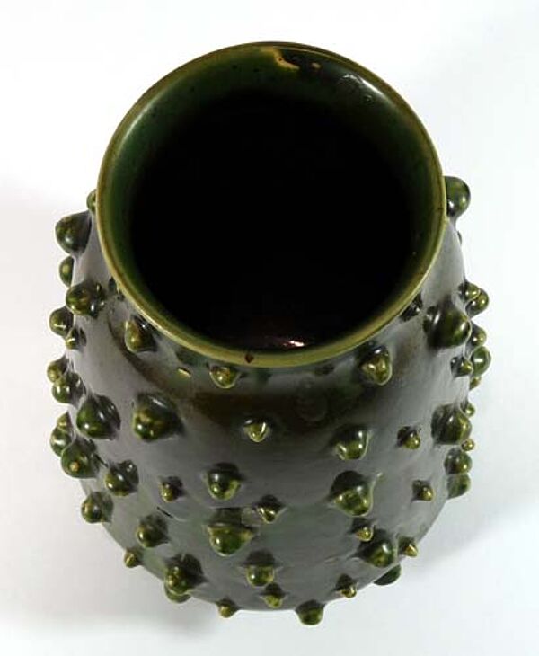 Der flach gebauchte Korpus hat einen fast gerade verlaufenden bzw. minimal ausgestellten Halsbereich, außenseitig ist er mit einer Vielzahl verschieden großer Noppen übersät. Dunkelgrüne Glasur, einige kleine Inseln des hellen Scherbens sind nicht glasiert, hiervon eine mit rundlicher Konfiguration (evtl. fehlt hier auch eine der Dekornoppen, allerdings müßte sie dann vor dem Glasurbrand abgefallen sein, das die Glasur hier dem Scherben komplett anliegt und dies somit auch vom Künstler bemerkt bzw. akzeptiert wurde). Höhe ca. 24 cm, diskrete Gebrauchsspuren. Unterseitig gemarkt: (nicht gedeutet) und datiert "Komi 1952".