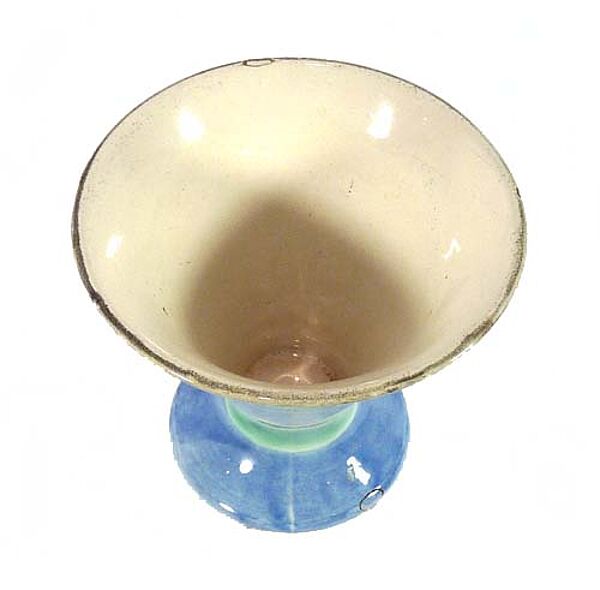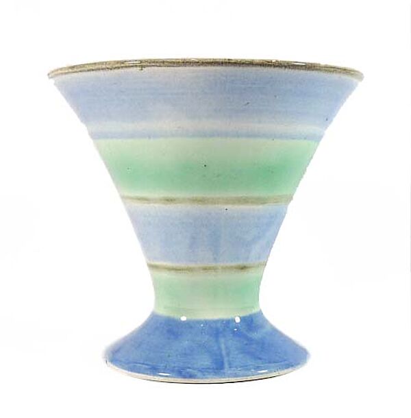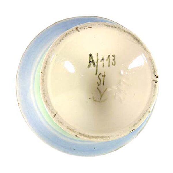 Trichterartiger, sich nach unten verjüngender Korpus auf konischem Fuß. Heller Scherben, innen weiß glasiert, außen Banddekor in Grün und Blau, z.T. abgesetzt durch schwarze Streifen. Höhe ca. 12,5 cm, z.T. deutlichere Gebrauchsspuren, so zeigen sich zwei kleine, restaurierte Chips und ein Flohbiss am äußeren Rand. Unterseitig gemarkt sowie Form- oder Modell-Nr. "A/113" bzw. geprägt "2175". Das Dekor spricht für einen Entwurf von Ursula Fesca, so dass die Vase zwischen 1924 und 28 entstanden sein dürfte.