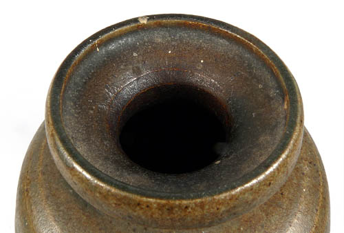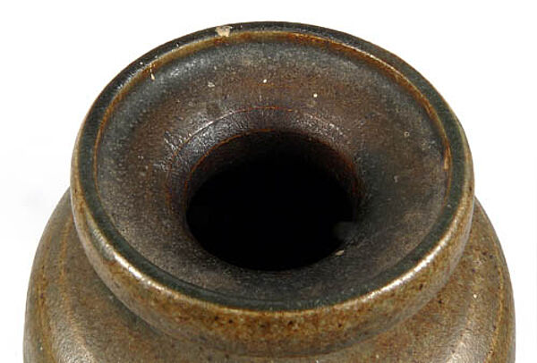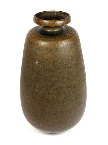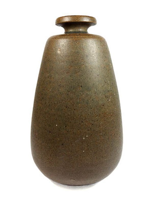 Flach gebauchter Keramikkorpus aus hellem Scherben mit eingezogenem Hals und ausgestelltem Mündungsrand. Höhe ca. 26 cm, kleine Glasurfehlstelle am äußeren Mündungsrand. Unterseitig nicht aufgelöste Markung, DDR (vermutlich mitteldeutscher Raum), wohl 60er Jahre.