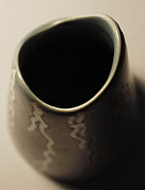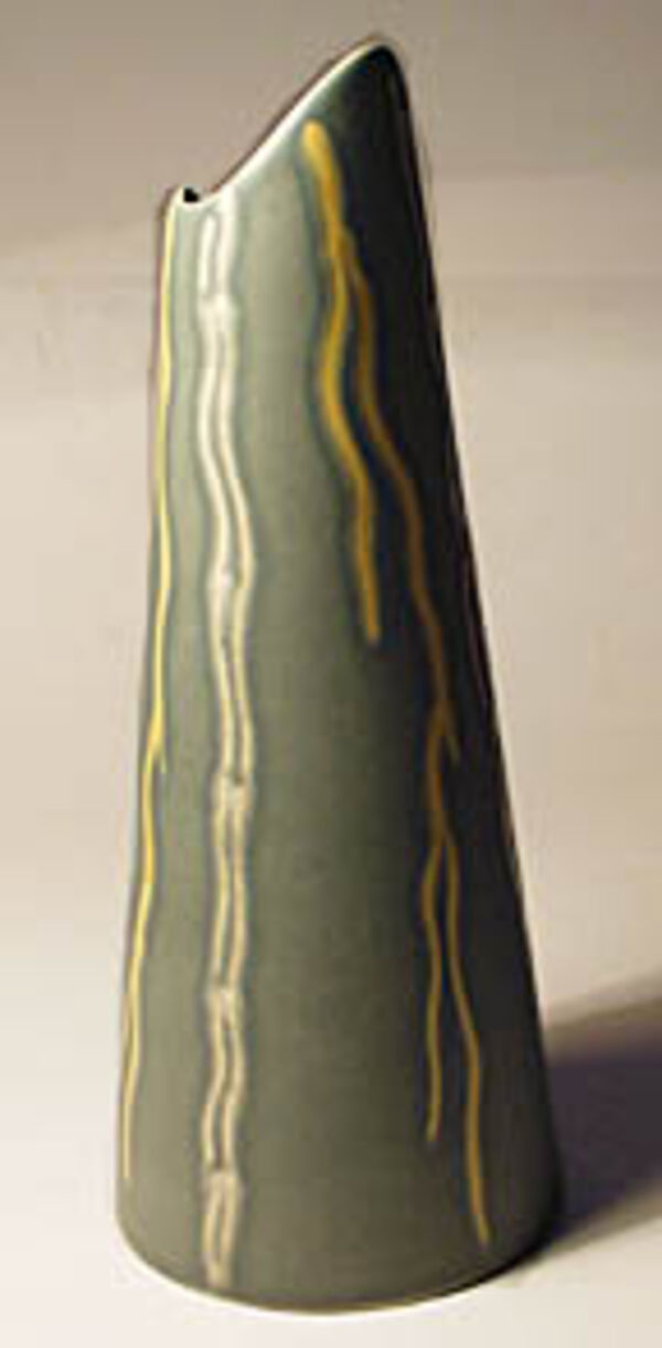 Länglicher, sich nach oben etwas verjüngender Korpus auf rundem Stand und mit unregelmäßig-geschwungen begrenztem Rand. Höhe ca. 20 cm. Heller Scherben, matt-grüne Glasur mit beige- und orange-farbenem, doppelläufigen Liniendekor. 60er Jahre.