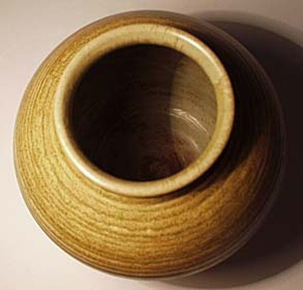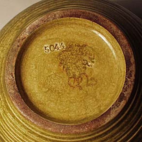 Angedeutet kugelförmiger Korpus mit leicht ausgestelltem Mündungsrand. Brauner Scherben mit gelb-brauner Glasur (Streifendekor). Höhe ca. 15 cm. Unterseitig gemarkt ("V & B") sowie Form- und Dekor-Nr. "5044". Wohl 20er, 30er Jahre.