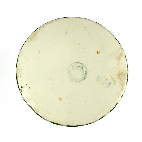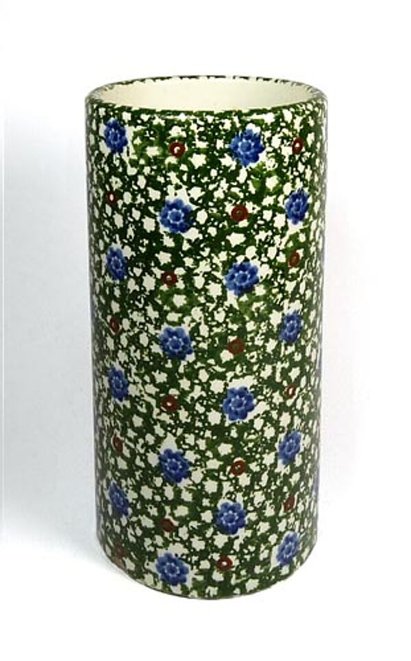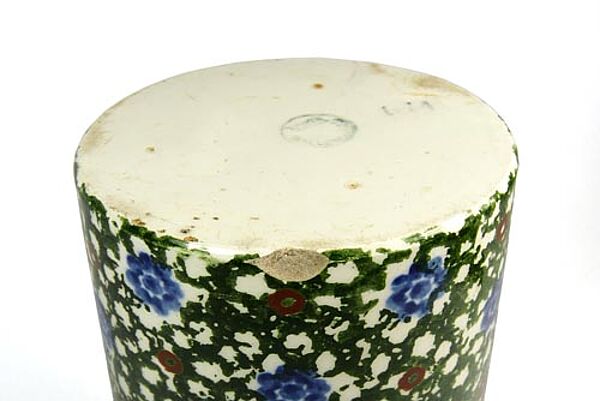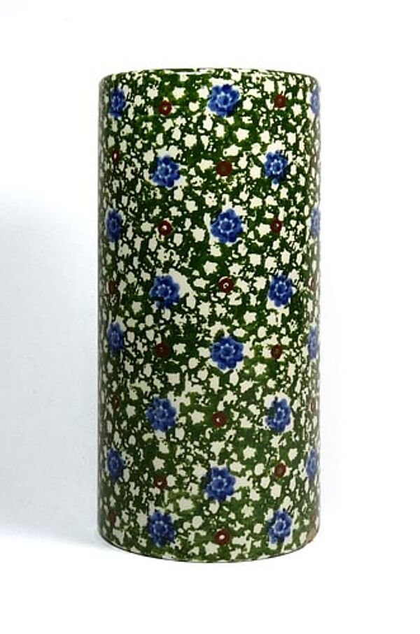 Zylindrischer Korpus aus hellem Scherben, florales, fein strukturiertes, polychromes Dekor. Höhe ca. 16,5 cm, Durchmesser ca. 8 cm. Am Fuß kleiner Abschlag (siehe Foto), ansonsten geringe Gebrauchsspuren. Unterseitig gemarkt, wohl um 1915.