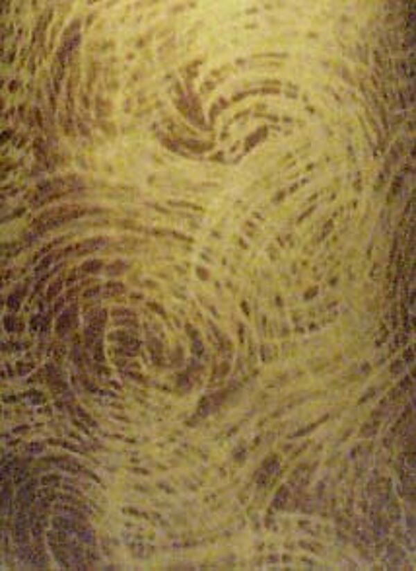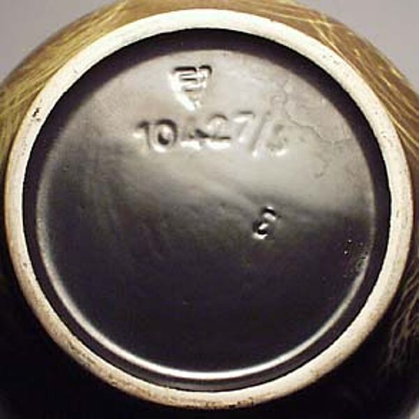 Länglicher, konisch sich nach oben verjüngender Korpus. Heller Scherben, braune Grundglasur, darauf schweifartiges gelb-braunes, helles Streifenmuster. H. ca. 24,5 cm. Unterseitig gemarkt sowie (Modell- oder Dekor-)Nummer, siehe Foto. Wohl 50er / 60er Jahre.