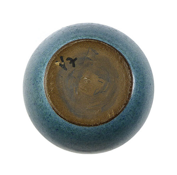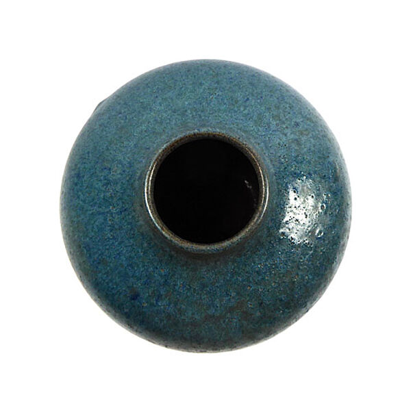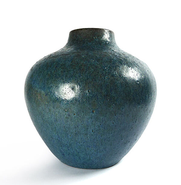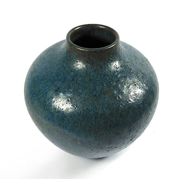 Im Schulterbereich gebauchter, zum Rand und zum Stand sich verjüngender Keramikkorpus aus grau-braunem Scherben, dunkel-türkisfarbener Glasur mit teilweise winzigen Kratern und vereinzelten kleinen Noppen. Höhe ca. 13,5 cm, geringe Gebrauchsspuren. Unterseitig gemarkt, wohl 1960er Jahre.