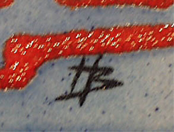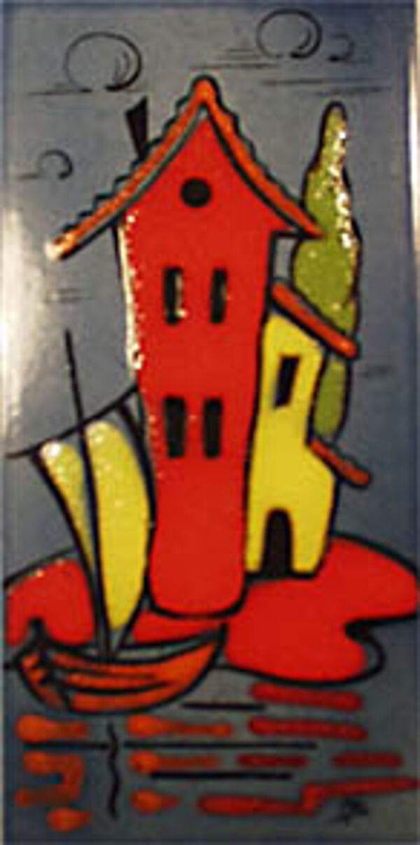 Leuchtende Farbigkeit, 15 cm X 30 cm, gut erhalten: rückseitig Reste von Montierungsspuren. Signiert mit "HB" (ungedeutet), Platte bezeichnet: "GROß; SMA; GERMANY". Deutschland, wohl 50er Jahre.