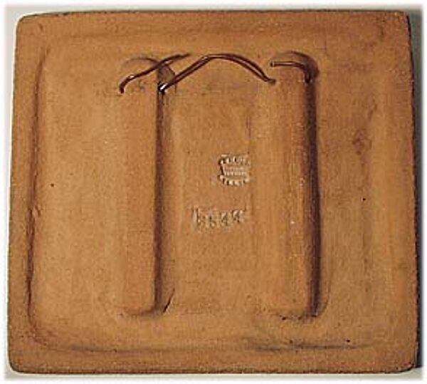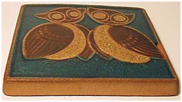 Rechteckiger Korpus, hellbrauner Scherben mit vorderseitig polychromen Eulenmotiv. Maße ca. 21 x 23,5 x 2,5 cm. Rückseitig gemarkt und Dekor-Nr. "8544", einfache Drahtaufhängung. Wohl Ende der 60er, Anfang der 70er Jahre.