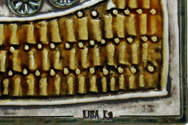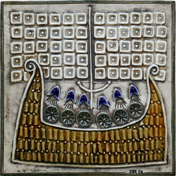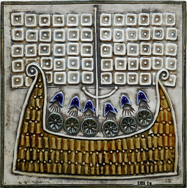 Quadratischer Korpus aus hellem Scherben. Oberseitig flach reliefierte, stilisierte, polychrom handglasierte Darstellung eines Wikingerschiffes mit 6 Mann Besatzung. Unten rechts geprägte Signatur "LISA L.". Maße ca. 22,5 x 22,5 cm, geringe Altersspuren. Rückseitig zwei kleine, ovale Aufkleber "Gustavsberg - Sweden" sowie vertieft im Scherben fixierte kupferne Aufhängeöse. Entwurf um 1960, Ausführung vermutlich später.