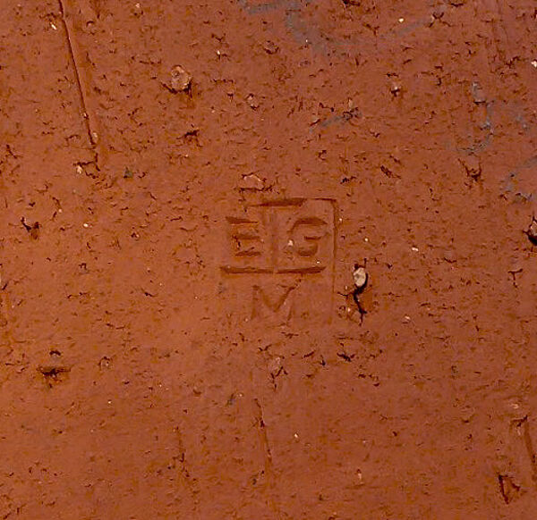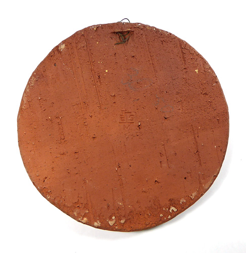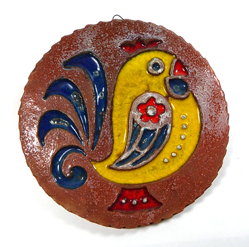 Scheibenförmiger Korpus aus rötlichem schamottartigem Scherben. Vorderseitig stilisierte Darstellung (flach in die Tiefe reliefiert) eines Vogels, der in leuchtenden Farben glasiert ist, die übrige Vorderseite ist farblos, die Rückseite ist unglasiert. Durchmesser ca. 20,5 cm, Stärke ca. 1,2 cm, geringe Altersspuren. Rückseitig ist am Oberrand eine Lochung zur Aufhängung, mittig eine Markung (nicht aufgelöst). Wohl Deutschland der 1970er Jahre.