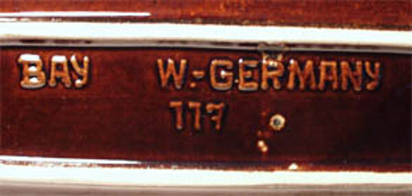 Korpus aus scheiben- bzw. doppelringförmigem Kerzenhalter und annähernd rechteckiger Wandplatte mit geprägtem, abstrahiert-floralen Dekor. Heller Scherben mit roter und schwarzer Glasur. Höhe: ca. 24,5 cm, Breite: ca. 9 cm. Rückseitig gemarkt "Bay W.-Germany 117", wohl 60er/70er Jahre.