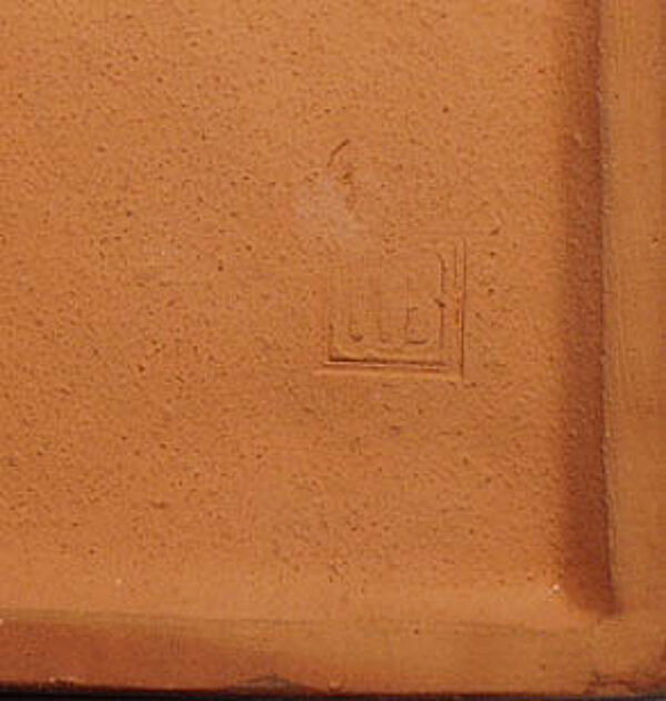 Hochrechteckiger Korpus aus hellbraun-rötlichem Scherben. Vorderseitig reliefierte, polychrome Darstellung eines schreitenden Kronenkranichs zwischen floralen Elementen. Maße ca. 31,5 x 12 cm, nur minimalste Gebrauchsspuren. Rückseitig ungedeutete Pressmarke (KB?), wohl Deutschland oder Dänemark der 60er Jahre.