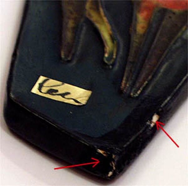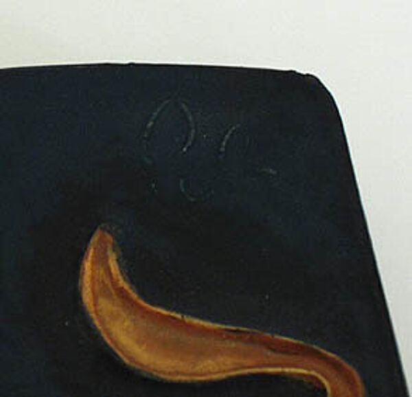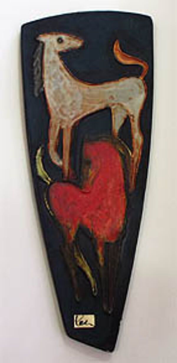 Länglicher, asymmetrisch-viereckiger, flacher Korpus. Heller Scherben, vorderseitig flach reliefiertes Motiv zweier leicht stilisierter, polychromer Pferde auf dunkelgrünem Grund. Höhe ca. 43,5 cm, es zeigen sich Alters- bzw. Gebrauchsspuren, insbesondere weist die rechte untere Ecke eine ca. 2,5 cm große, restaurierte Glasurbeschädigung auf, zudem kann man im Randbereich zwei Chips ausmachen. Neben der rückseitigen Markung ist vorderseitig noch der originale Firmenaufkleber vorhanden. Wohl 1950er Jahre.