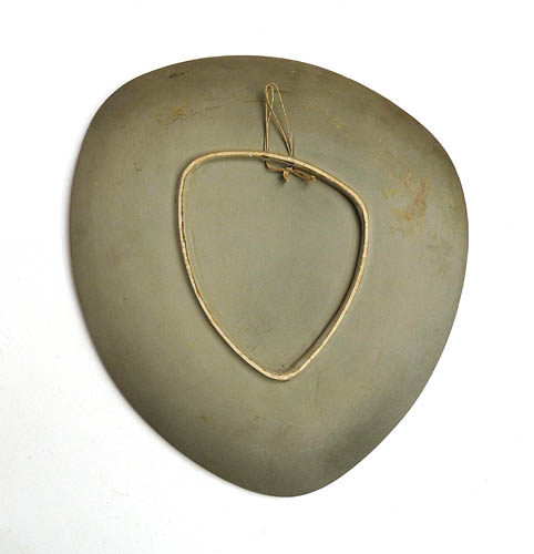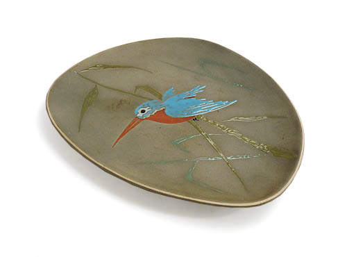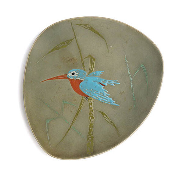 Flach gemuldeter, annähernd dreieckiger Korpus mit abgerundeten Ecken und leicht konvexen Seitenkanten auf flachem Fuß (hier zwei kleine Löcher für eine Schlaufe zur Aufhängung). Heller Scherben mit etwas rauer, grau-grüner Grundglasur. Oberseitig handgemaltes, polychromes Motiv eines im Gras sitzenden (Eis-)Vogels. Maße ca. 27 x 24 cm, Höhe ca. 1,7 cm, am oberen Rand winziger Chip, leichte Gebrauchs- und Verschmutzungsspuren. Ungemarkt, wohl Deutschland der 50er Jahre.