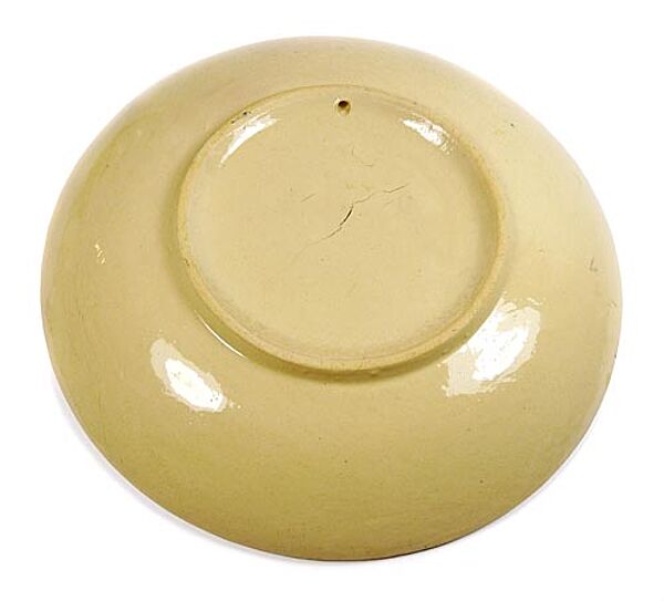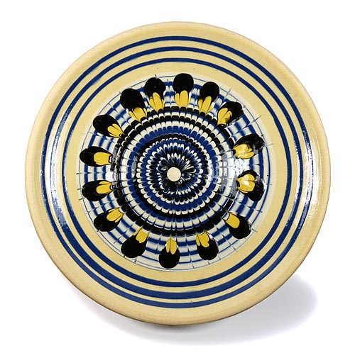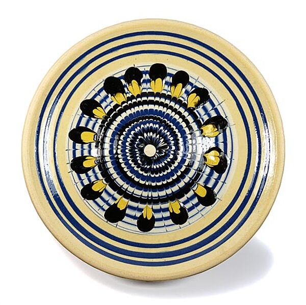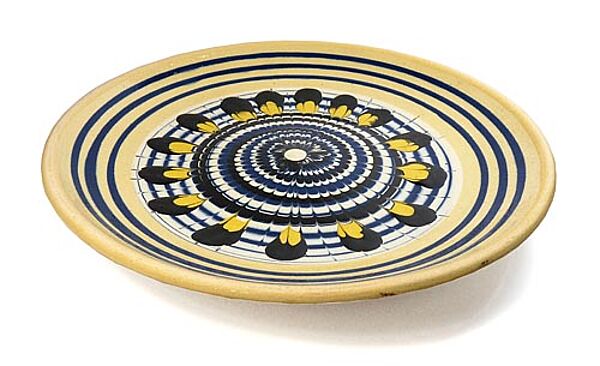 Runder, flach-schalenförmiger Korpus auf schmalem Standring. Heller Scherben, unterseitig farblos glasiert, z.T. auch oberseitig, hier zudem blau-gelbes, abstraktes Dekor mit Ring- und Spiralelementen. Durchmesser ca. 22,5 cm, minimale Gebrauchsspuren. Rückseitig Loch zur Aufhängung. Ungemarkt, wohl 50er bis 70er Jahre.