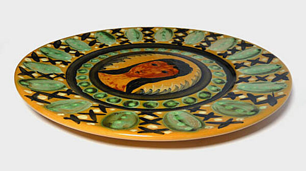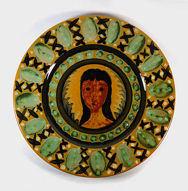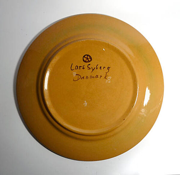 Oberseitig handbemalter, polychrom glasierter, unterseitig monochrom ocker glasierter Keramikteller, der im Spiegel ein Gesicht eines jungen Mädchens zeigt, im Randbereich abstraktes Dekor. Durchmesser ca. 35 cm, Höhe ca. 3,3 cm, geringe Gebrauchsspuren. Unterseitig signiert, wohl 50er, 60er Jahre (Lars Syberg eröffnete seine Werkstatt in den 1920er Jahren auf Seeland).