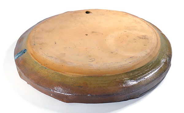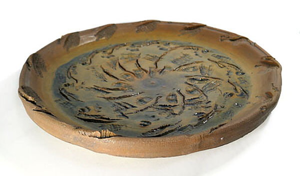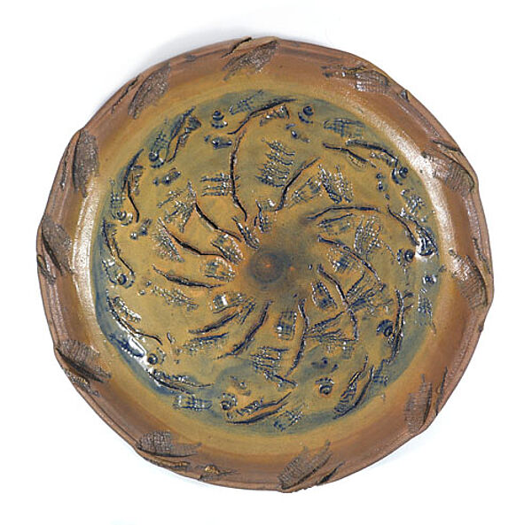 Flach schalenförmiger Korpus aus beige-braunem gedrehten Scherben (der Ton stammt von der Baustelle der hallischen Hochstraße). Oberseitig abstraktes, geritztes Liniendekor sowie Muschelabdrücke, in Braun- und Grautönen glasiert. Durchmesser ca. 31 cm, gerineg Altersspuren. Der Teller ist unsigniert, wir haben ihn aber direkt von der Künstlerin erworben. Um 1975.
