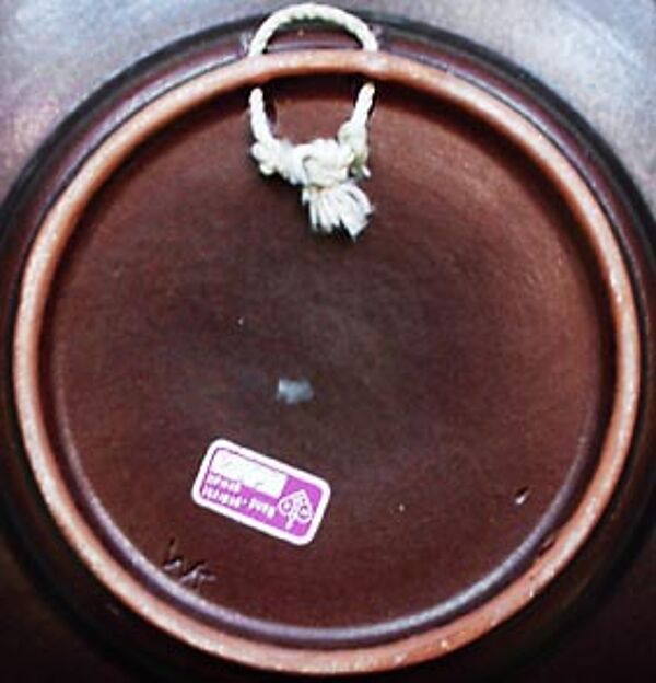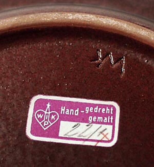 Der Wandteller hat einen breiten, fast wie bei einer Schale gewölbten Spiegel. Heller Scherben, unterseitig braun, oberseitig grün/schwarz glasiert. Geritztes, stilisiertes Blumendekor, D. ca. 23,5 cm. Unterseitig gemarkt sowie Aufkleber mit dem Verweis, daß es sich um ein handgedrehtes bzw. hangemaltes Stück handelt. Wohl um 1960/70.
