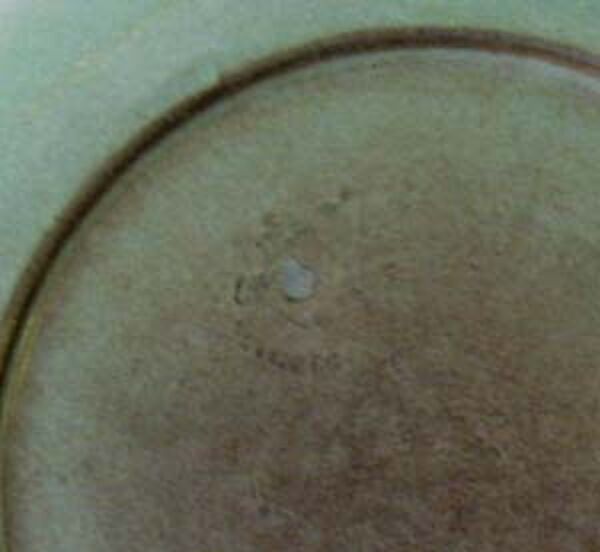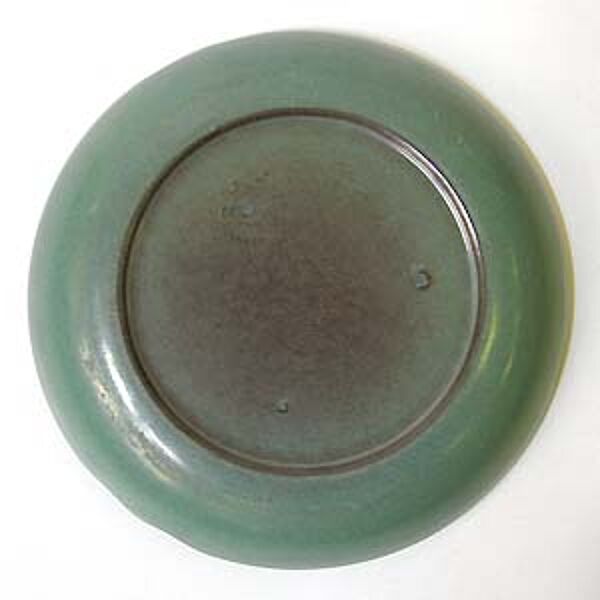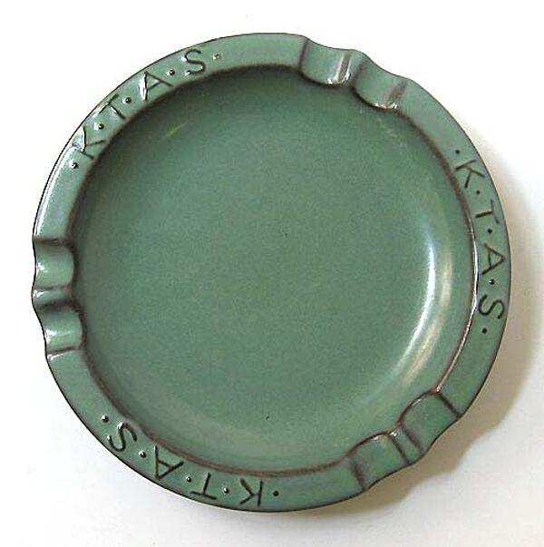 Sachlich gestalteter, flach-schalenförmiger Korpus mit drei "doppelläufigen" Zigarren- bzw. Zigaretten-Ablagen. Brauner Scherben mit homogen grüner Glasur, im Randbereich sind reliefiert dreimal die Buchstaben der dänischen Telefongesellschaft K.T.A.S. aufgebracht. Durchmesser ca. 17 cm, insgesamt moderate Gebrauchsspuren, allerdings zeigen sich im Randbereich einige "Flohbisse". Unterseitig unleserlich gemarkt (dänischer Hersteller, man erkennt rudimentär ein Wappen mit Schrift), wohl 30er Jahre.