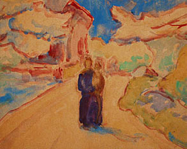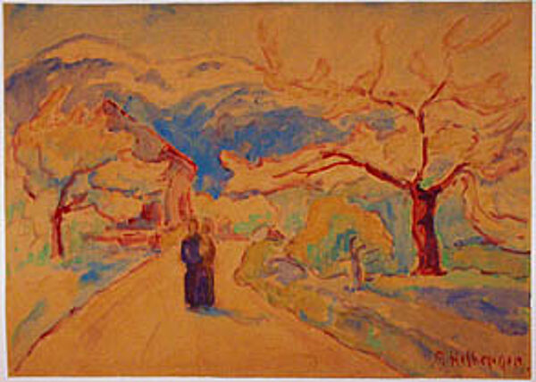 Expressives Aquarell auf gelbtonigem Papier mit den Maßen ca. 43,5 x 31 cm. Das Blatt wurd von einem Papierrestaurator an den Kanten teilweise verstärkt bzw. hier ursprünglich vorhandene kleinere Einrisse professionell hinterklebt. Rechts unten signiert, wohl um 1918/20.