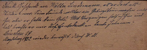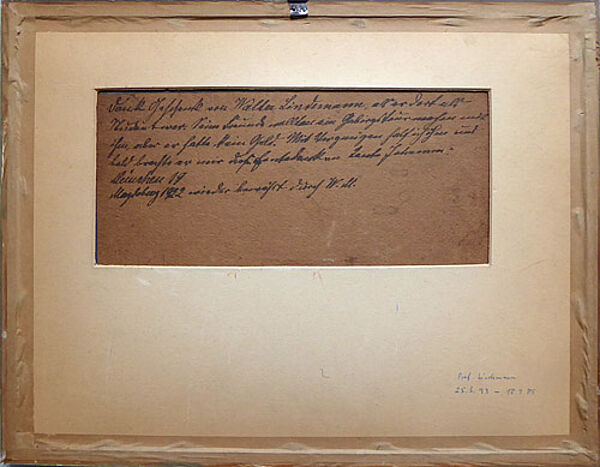 Aquarell auf Papier, rückseitig mit Text versehen, darunter zwei Ortsbezeichnungen mit Datierung: "München 19" sowie "Magdeburg 1922". Das Bild stammt aus dem Nachlaß des Historikers Prof. Lindemann ((1893 - 1985) / Halle. gerahmt. Bildmaße ca. 33 x 23,5 cm, Außenmaße einer älteren, aber späteren, gold gefassten, leicht reliefierten Holzleiste ca. 46 x 34,5 cm, geringe Alters- und Lagerspuren.