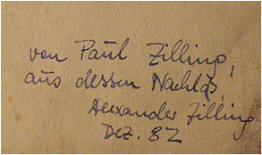 zu Paul Zilling: geb. am 06.09.1900 in Halle; 1917/18 Kriegsdienst; 1919 - 24 Besuch der Kunstgewerbeschule Burg Giebichenstein, Klasse von Erwin Hahs; 1924 Übersiedlung nach Hamburg, dort zusammen mit seiner Frau Werkstatt für kunstgewerbliche Arbeiten; 1926/27 Aufenthalt in Paris; 1929 - 33 Studium an der Burg Giebichenstein in Halle, hier Meisterschüler von Erwin Hahs; ab 1933 freischaffend in Halle; ab den 40er Jahren Verschlimmerung einer chronischen Krankheit, 1949 entsteht sein letztes Ölgemälde; am 20.03.1953 in Halle gestorben; große Teile seines künstlerischen Nachlasses sind in der Stiftung Moritzburg in Halle/ Kunstmuseum des Landes Sachsen-Anhalt. Quelle: "Paul Zilling" herausgegeben vom halleschen Kunstverein 2004.