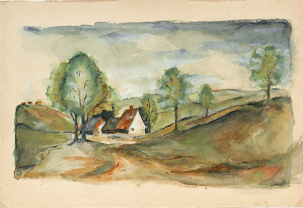 Aquarell auf chamoistonigem Papier. Blattmaße ca. 26,6 x 18,2 cm, Bildmaße ca. 24,3 x 13,5 cm, geringe Alters-, Griff- und Lagerspuren. Vermutlich um 1947 / 48 - wir haben aus der Nachlassauktion Hellmuth Chemnitz eine Serie von 5 Blatt kleinformatiger Aquarelle erworben, die stilistisch und inhaltlich sehr ähnlich sind, eine dieser Arbeiten ist signiert und datiert, siehe Art.Nr. 6883.
