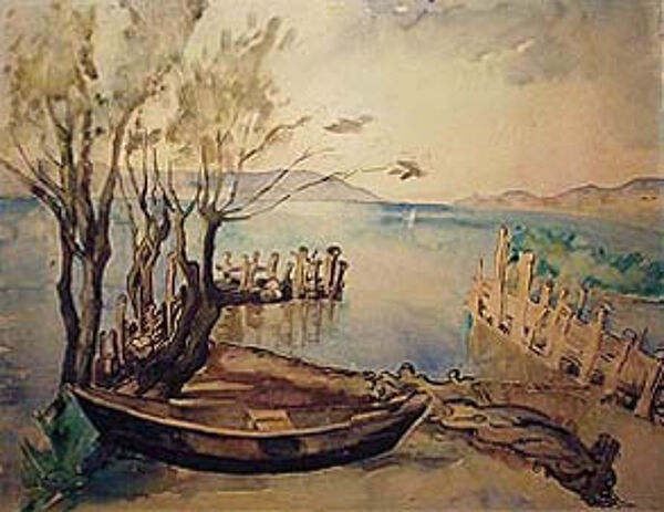 Aquarell: Seeufer mit Boot