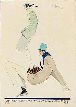 Aquarellierte Bleistiftzeichnung: "Was man heuer im Winter in seiner kalten Bude tut" von 1920