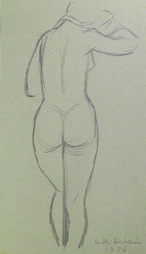 Bleistiftzeichnung: Rückenansicht eines stehenden weiblichen Aktes von 1936