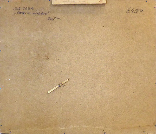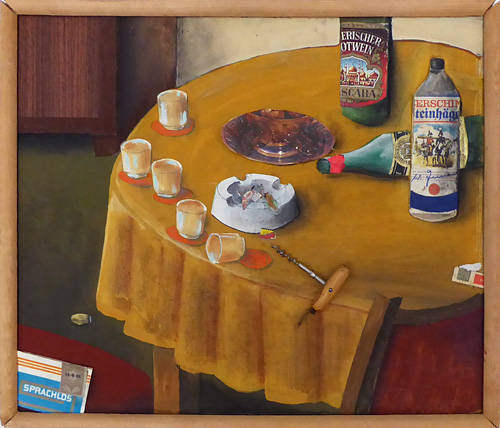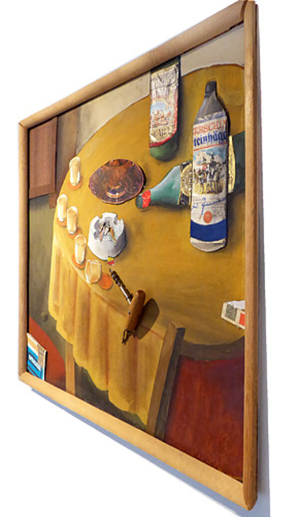 Assemblage (Mischtechnik sowie diverse Verpackungen aus den 1980er Jahren, Furnier, Korkenzieher) auf Hartfaser, rückseitig bezeichnet, datiert und monogrammiert. Außenmaße der schmalen, originalen, einfachen Holzleiste ca. 65,5 x 56,2 cm, geringe Altersspuren. Die im Aschenbecher ehemals fixierte Zigarettenkippe ist verlorengegangen, könnte aber problemlos ersetzt werden...