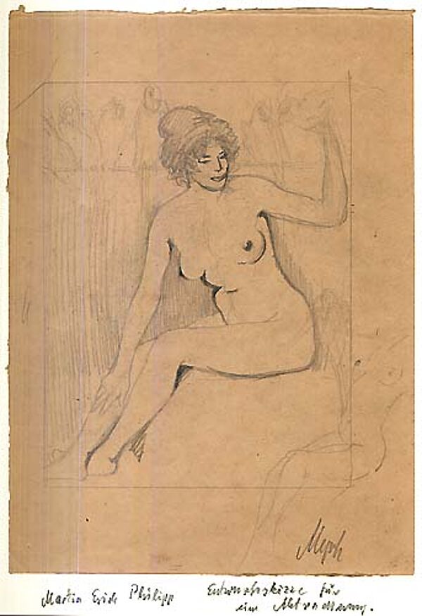 Bleistiftzeichnung auf ockerfarbenem Papier, vermutlich Entwurfsskizze für eine Radierung, Blattmaße ca. 22,5 x16 cm, Bildmaße ca. 16 x 12 cm, rechts unten handsigniert, rückseitig datiert 1923, montiert auf Passepartout, moderate Lager- und Griffspuren, leicht fleckig, etwas unregelmäßiger Rand.