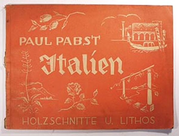 Publikation des hallischen Künstlers Paul Pabst von 1933 (vermutlich Eigenverlag) mit dem Titel "Italien - Holzschnitte u. Lithos", 25 ganzseitige Abbildungen, mit einem Vorwort von Hans Dannehl. Äußerlich moderate, im Bereich der Bindung (etwas rostige Klammern) bzw. des Rückens deutlichere Gebrauchsspuren (so weisen der Rücken und zwei weitere Blätter hinterklebte Einriße auf), die Blätter mit den Darstellungen selbst sind relativ frisch und zeigen nur diskrete Griffspuren.