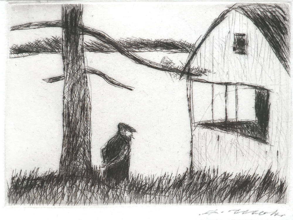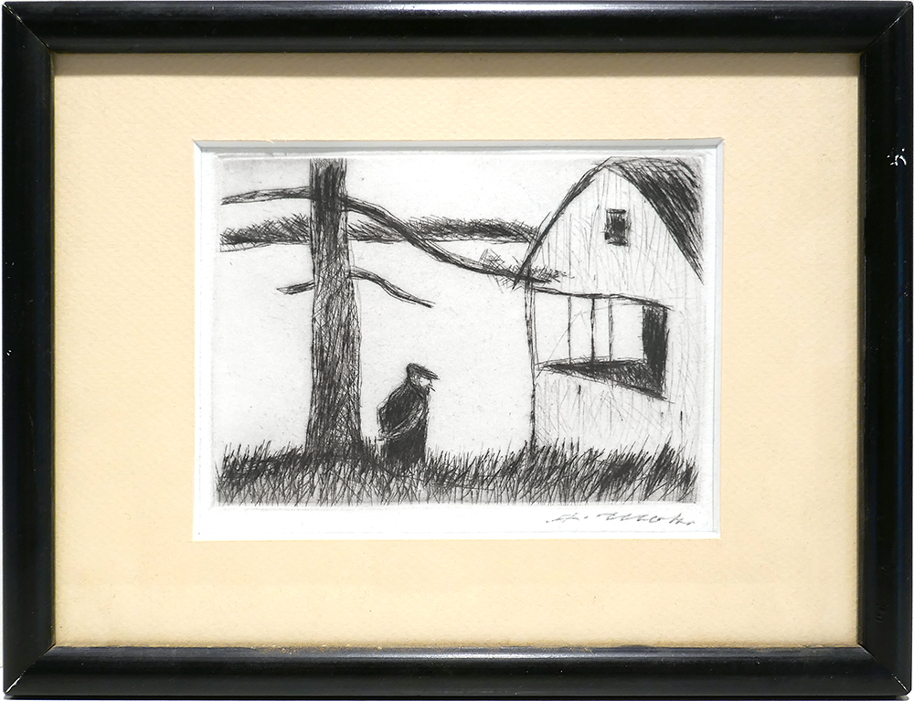Kaltnadelradierung in Schwarz auf hellchamois Weißenborn von 1960. Darstellungs(bzw. Platten-)maße ca. 10,0 x 13,5 cm, Außenmaße der einfachen, älteren, schwarz gefassten Holzleiste:ca. 24 x 18,5 cm. Geringe Alters-, Griff- und Lagerspuren.