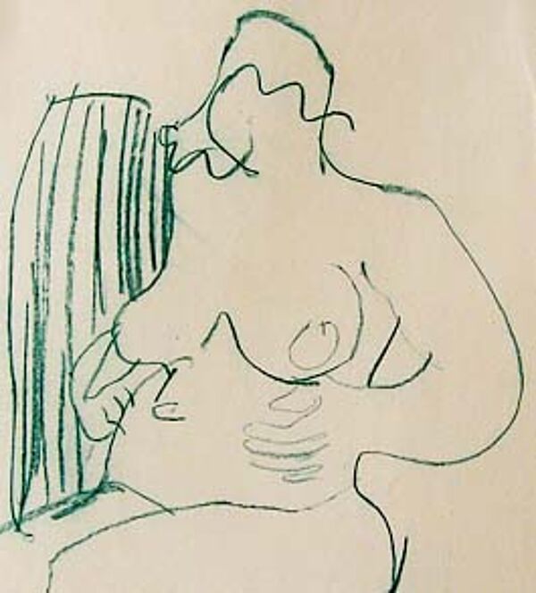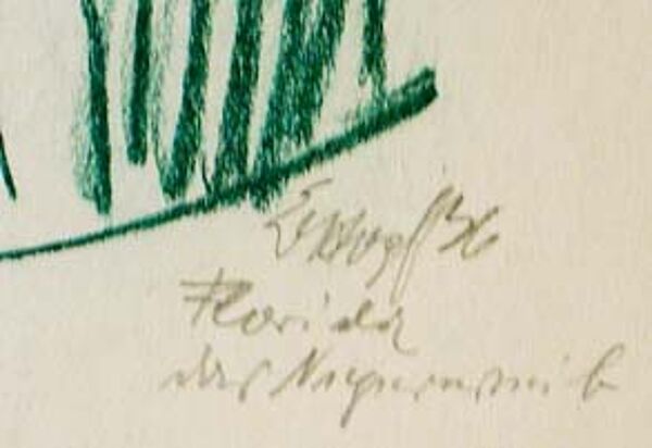 Farbige (grüne) Wachskreide auf Papier, rechts unten signiert, datiert (19)"36" und bezeichnet: "Florida - das Negerweib". Blattgröße ca. 44 x 29 cm. Zum Teil weist das Blatt Griff- und Knickspuren sowie an den Ecken winzige Einstichlöcher von Reißzwecken auf.