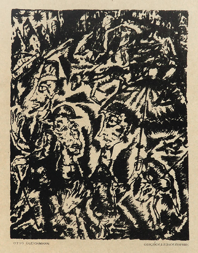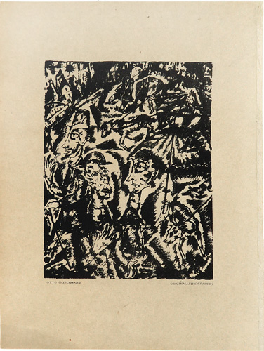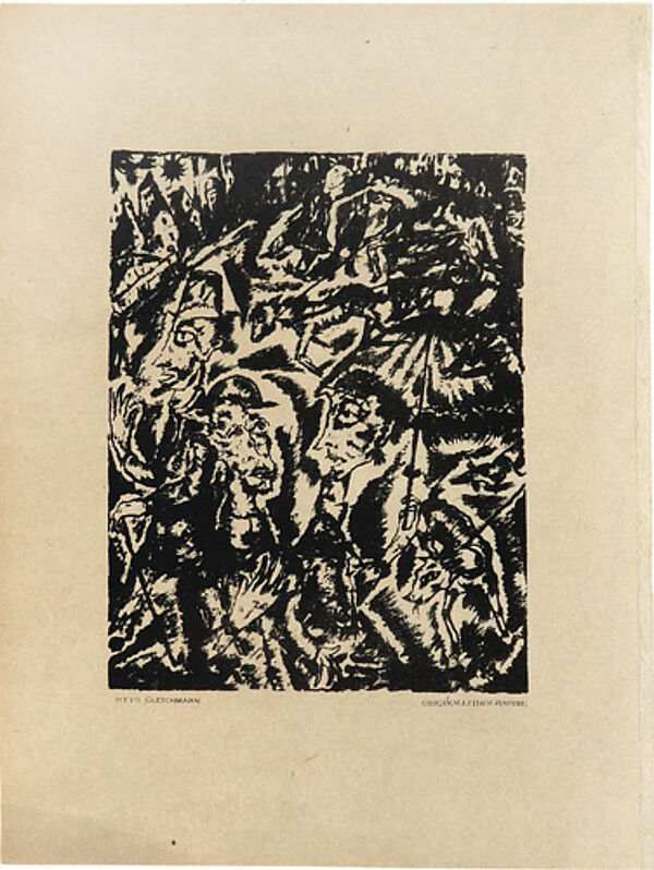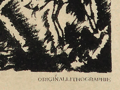 Lithografie auf bräunlichem Papier. Unterhalb der Darstellung typografisch bezeichnet. Blattmaße ca. 28,5 x 21,4 cm, Bildmaße ca. 17,7 x 13,6 cm, geringe Alters-, Griff- und Lagerspuren, am rechten Rand Reste der Bindung (aus "Das Kunstblatt", Heft 7, herausgegeben von Paul Westheim, Potsdam-Berlin 1919). Söhn HOG 31807. Rifkind 807.