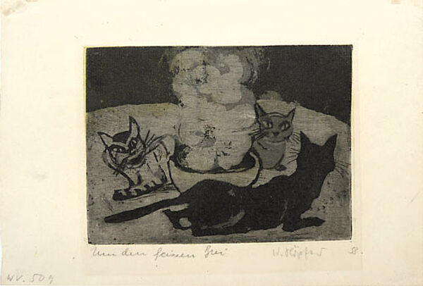 Farbradierung auf leicht chamoistonigem Papier, rechts unterhalb der Darstellung mit Bleistift handsigniert und datiert (19)"38", links unterhalb der Darstellung betitelt, am linken unteren Rand von fremder Hand vermerkt "WV 509" (dort mit dem Titel "Um den heißen Brei"). Blattmaße ca. 21 x 14,5 cm, Bildmaße ca. 13,3 x 9,8 cm, geringe Alters-, Griff-, Fleck- und Lagerspuren, insbesondere zeigen sich rückseitig Reste einer alten Montierung. Hierbei handelt es sich um eines der recht raren noch erhaltenen frühen Abzüge des Künstlers, viele der vorhandenen Blätter dieser frühen Jahre wurden erst später, also in der Nachkriegszeit abgezogen.