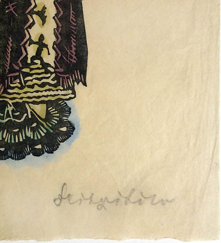 Farbholzschnitt auf Japanpapier, rechts unten mit Bleistift handsigniert, oberhalb der Darstellung alte (Sammlungs?)Stempelung: "XII". Blattmaße ca. 29,5 x 20,7 cm. Neben allgemeinen Alters-, Griff- und Lagerspuren zeigen sich insbesondere im oberen Randbereich geringe Stauchungen und Knitter bzw. rückseitig Klebereste alter Montierungen. Wohl 1915 bis 20.