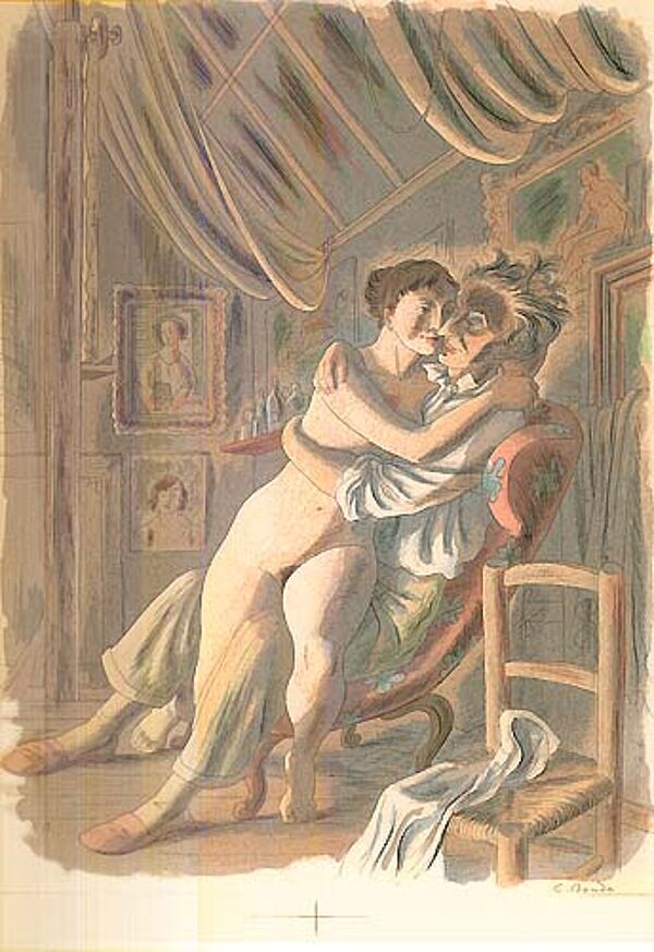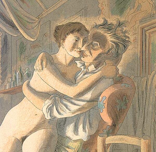 Farblithografie: ohne Titel (Künstler mit Modell im Atelier)