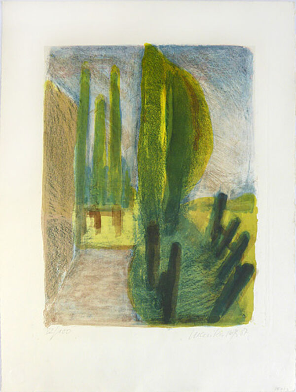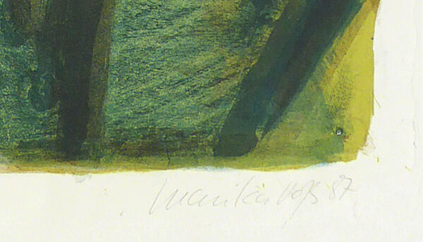 Farblithografie auf Bütten (mit Wasserzeichen), rechts unten mit Bleistift handsigniert, datiert (19)87, links unten bezeichnet 32/100. Blattmaße ca. 53,5 x 39,5 cm, Bildmaße ca. 42 x 32 cm, gerineg Alters-, Griff- und Lagerspuren.