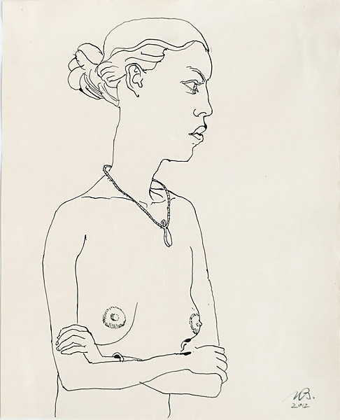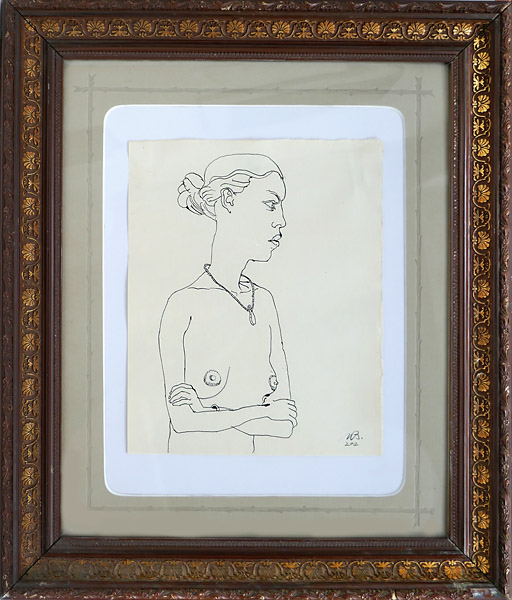 Federzeichnung auf leicht chamoistonigem Papier, rechts unten monogrammiert und datiert "2012". Blattmaße ca. 34 x 27,5 cm (frei im antiken Foto-Passepartout), Außenmaße der antiken, reliefierten, gold verzierten, ansonsten braun gefassten Holzleiste ca. 65,5 x 56 cm, geringe Altersspuren.