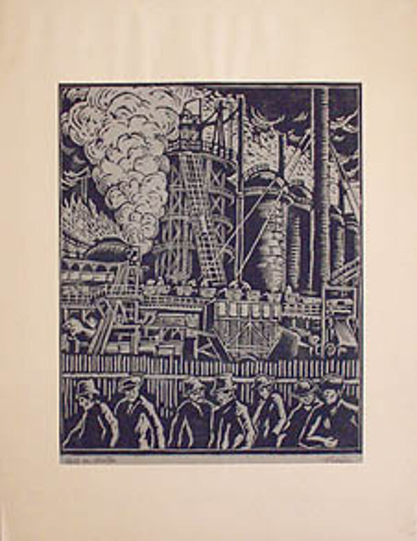 Holzschnitt mit den Maßen 41,6 x 34,4cm (Blatt-Größe); 39,5 x 33cm (Darstellungs-Größe). Arbeiter vor Fabrik, unterer Rand etwas faltig, unten bezeichnet (ungedeuteter Titel) und signiert. Wohl um 1920.
