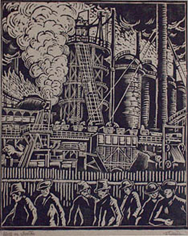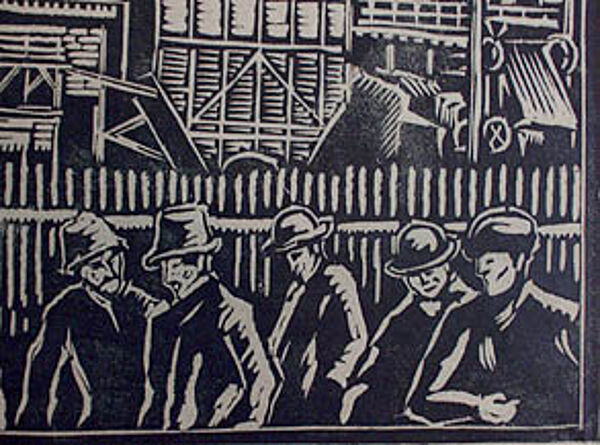 Holzschnitt: Arbeiter vor Fabrik