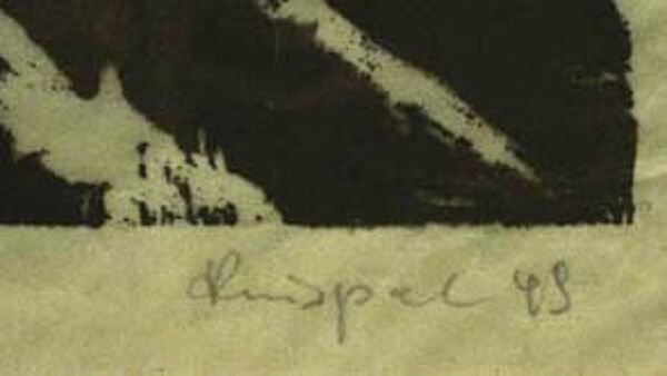 Holzschnitt auf pergamentartigem Papier (z.T. diskret gebräunt, im Randbereich vereinzelt kleine Einrisse bzw. leichte Knickspuren). Höhe ca. 68 cm, Breite ca. 53 cm. Signiert und datiert 1949.