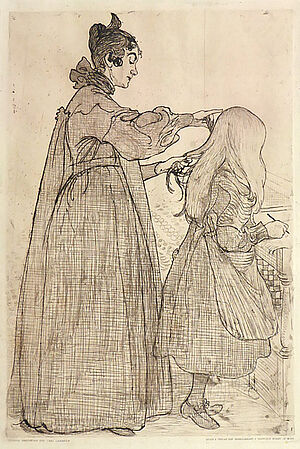Aquarellierte Tuschzeichnung: Entwurfszeichnung für die Fliegenden Blätter (Mutter und Kind m Zoo)