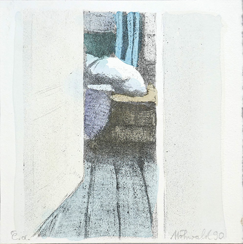 Farblithografie auf kräftigem Papier, rechts unten mit Bleistift handsigniert und datiert (19)"90", links unten bezeichnet "E.a.". Blattmaße ca. 19,5 x 19 cm, geringe Alters-, Griff- und Lagerspuren.