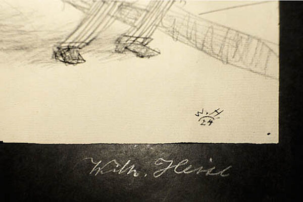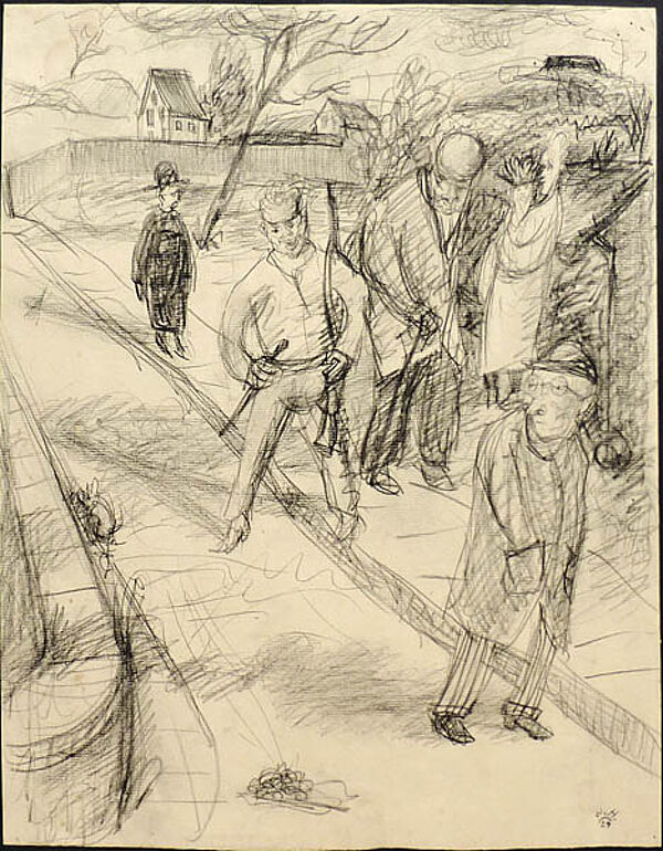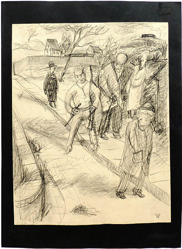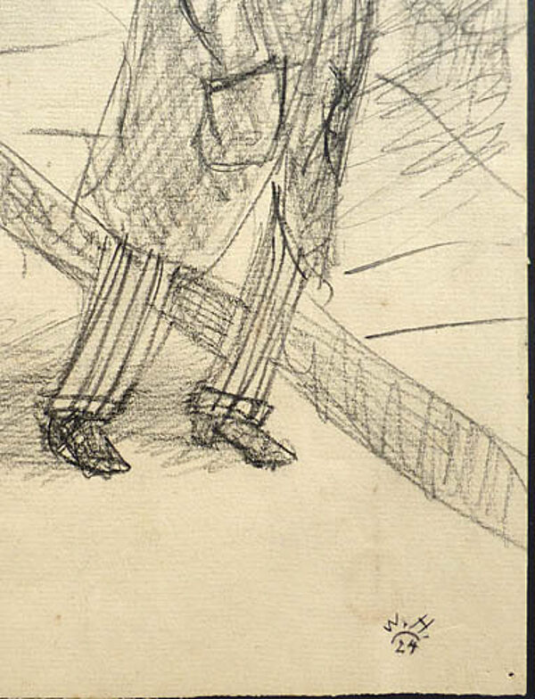 Kohle auf Papier, montiert auf schwarzem Karton, bezeichnet: 13.) Gegner, M50, rechts unten monogrammiert und datiert (19)"24", auf Unterlagekarton signiert. Blattmaße ca. 39,3 x 30,8 cm, geringe Alters-, Griff- und Lagerspuren.