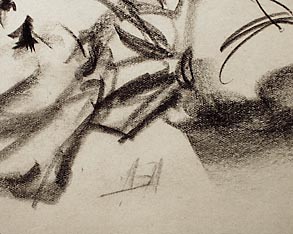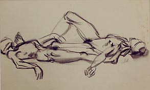 Expressive Kohlezeichnung eines liegenden Paares, monogrammiert, zudem rückseitig Nachlass-Stempel, Blatt-Maße ca. 50 x 35 cm. An den Seitenrändern kleinere Einrisse bis 2 cm, Reste alter Montierung (Klebestreifen), geringer Papierverlust an einer Ecke, am Rand winziges Loch (3 mm). Insgesamt aber relativ guter Zustand, sämtliche o.g. Mängel sind außerhalb der Darstellung. Wohl Ende der 20er Jahre (auf jeden Fall vor der Eheschließung mit E. Th. Holtz, danach sind die Arbeiten mit "HSH" monogrammiert).